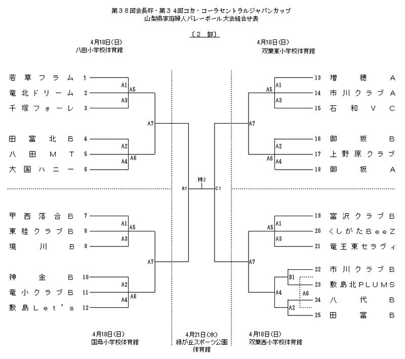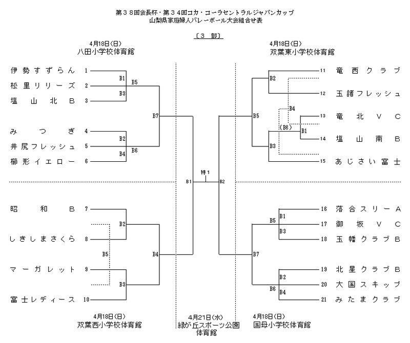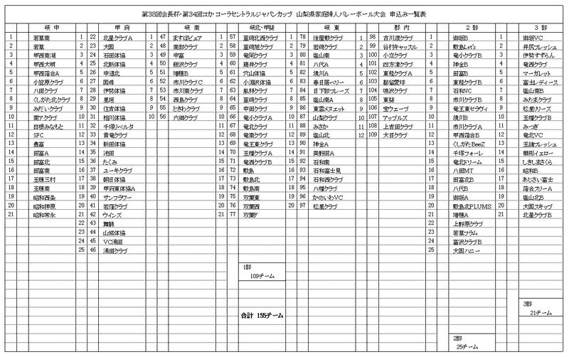 第38回 会長杯 第34回 コカ・コーラセントラルジャパンカップ 会長杯/コカ・コーラボトラーズジャパン 2010.03.202018.11.28 出場全チーム一覧 & 1部2部3部・組合せ表 ▼出場全チーム一覧 ※ ←クリックにて別ウィンドウ表示します。 ▼1部・組合せ表 ※ ←クリックにて別ウィンドウ表示します。 ▼2部・組合せ表 ※ ←クリックにて別ウィンドウ表示します。 ▼3部・組合せ表 ※ ←クリックにて別ウィンドウ表示します。