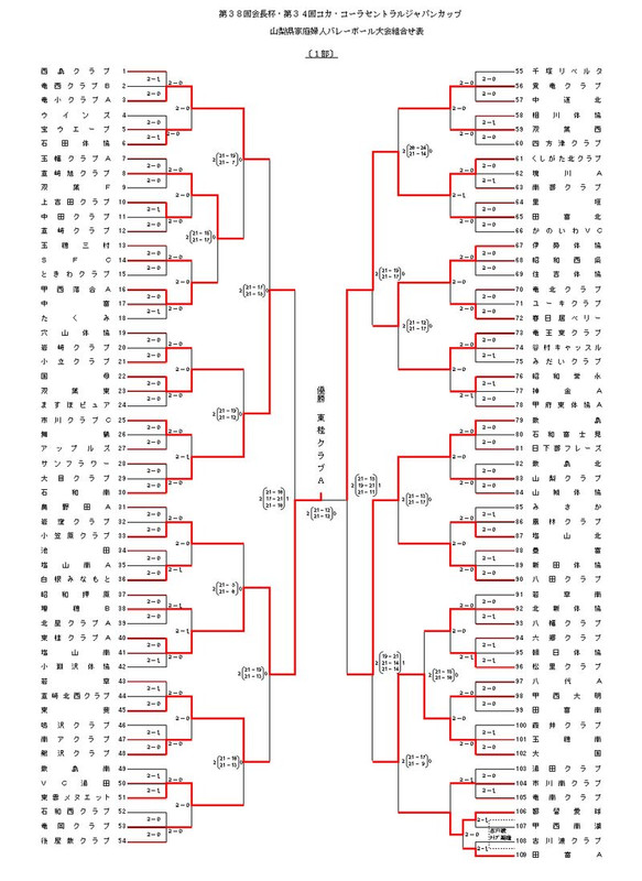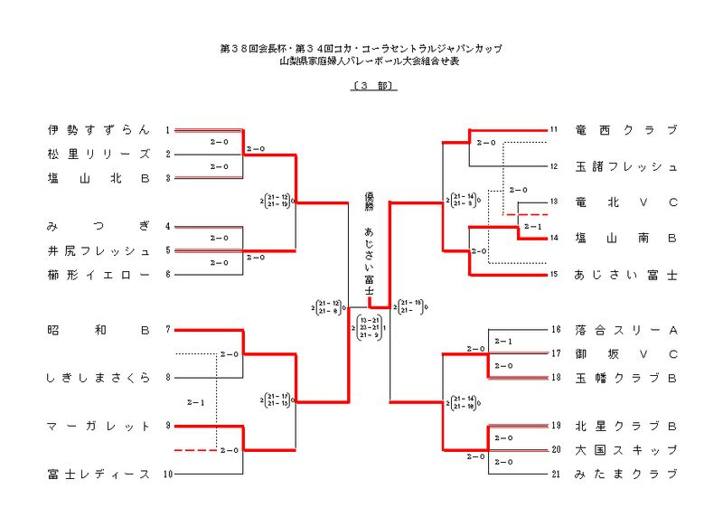 ■ 1部 優勝 : 東桂クラブA ■ 2部 優勝 : 御坂 ■ 3部 優勝 : あじさい富士 ▼1部 ※ ←クリックにて別ウィンドウ表示します。 ▼2部 ※ ←クリックにて別ウィンドウ表示します。 ▼3部 ※ ←クリックにて別ウィンドウ表示します。