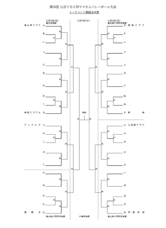 第39回 山日YBS杯ママさんバレーボール大会 山日YBS杯 2010.10.232018.11.27 出場チーム一覧表 & 1日目・組合せ表 & トーナメント表 ▼出場チーム一覧表 ▼1日目・組合せ表 ▼トーナメント表 ※下方からご覧ください。 ◇ ◆ ◇ ▼出場チーム一覧表 ※ ←クリックにて別ウィンドウ表示します。 ▼1日目・組合せ表 ※ ←クリックにて別ウィンドウ表示します。 ▼トーナメント表 ※ ←クリックにて別ウィンドウ表示します。