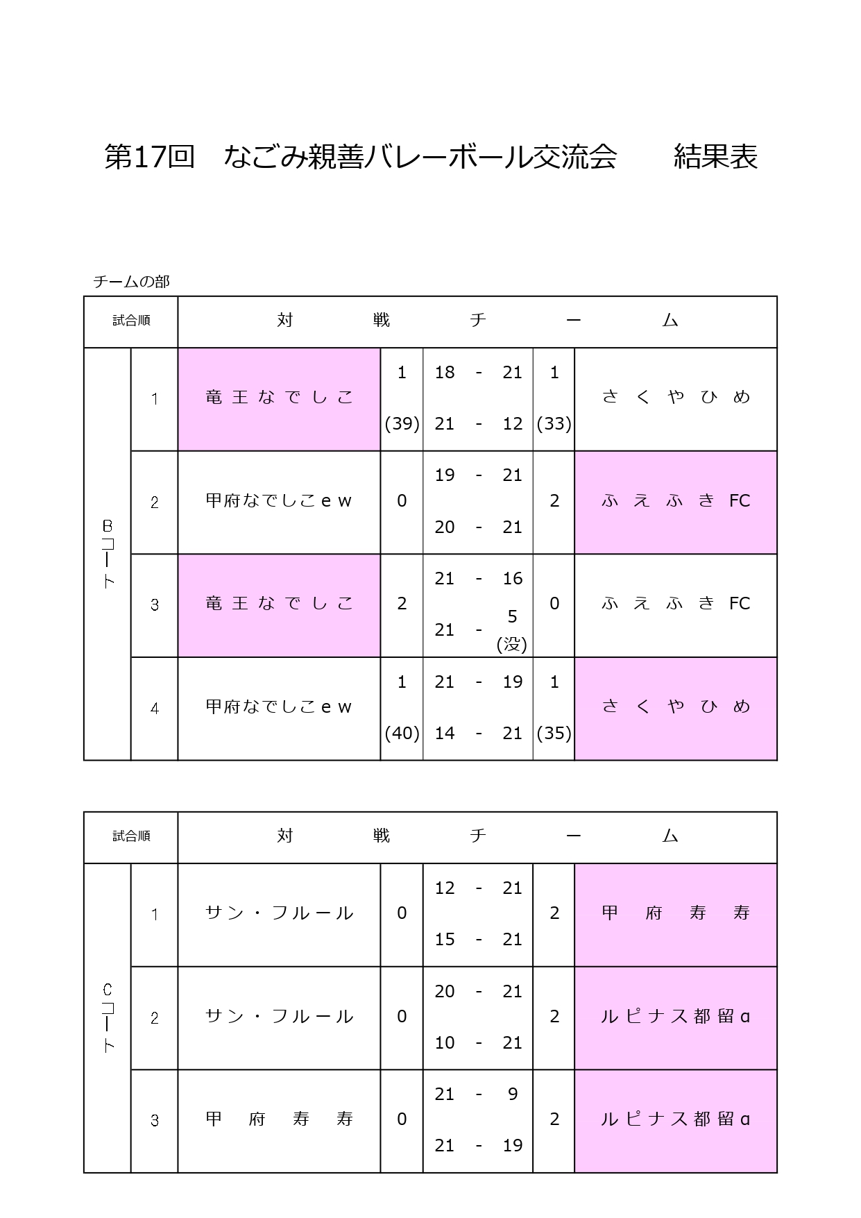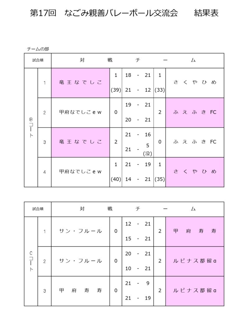 第17回なごみ親善バレーボール交流会 なごみの部結果表