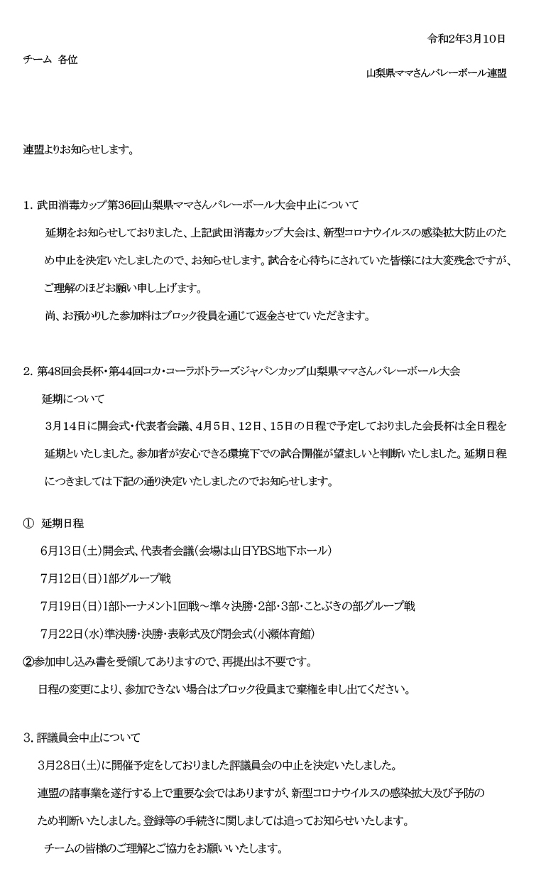 武田消毒カップ 第36回山梨県ママさんバレーボール大会【延期のお知らせ】