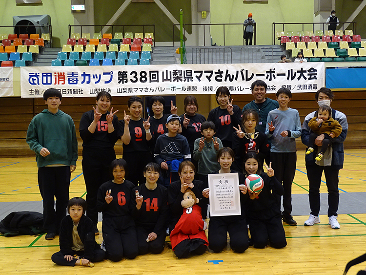 今大会2連覇を目指す春日居ベリーと2023年度主要大会4冠を目指す田富北との対戦となった。1セット、春日居15番小山田のスパイクを田富北1番三浦がシャットアウトでゲームがスタート。序盤はお互いに堅い守りからエースへ。ママさんとは思えない打点の高い打ち合いで5-5の同点。春日居セッター8番の橘田が15番小山田にボールを集め連続得点。田富北も粘りを見せるも11-6と春日居がリード。たまらず田富北がタイムアウト。しかし春日居4番根津の天井サーブがネットギリギリに決まり14-8と流れは春日居に。田富北はキャプテン三浦が大きく声をかけ仲間を鼓舞。自身もスパイクにブロックにと躍動、相手のミスも誘い14-16と猛追。春日居もここでタイムアウト。一息ついた春日居は勝負どころは全て小山田に託し19-5と突き放し、田富北が2回目のタイムアウトを取るも勢いは止められず21-16で春日居が1セットを奪取。